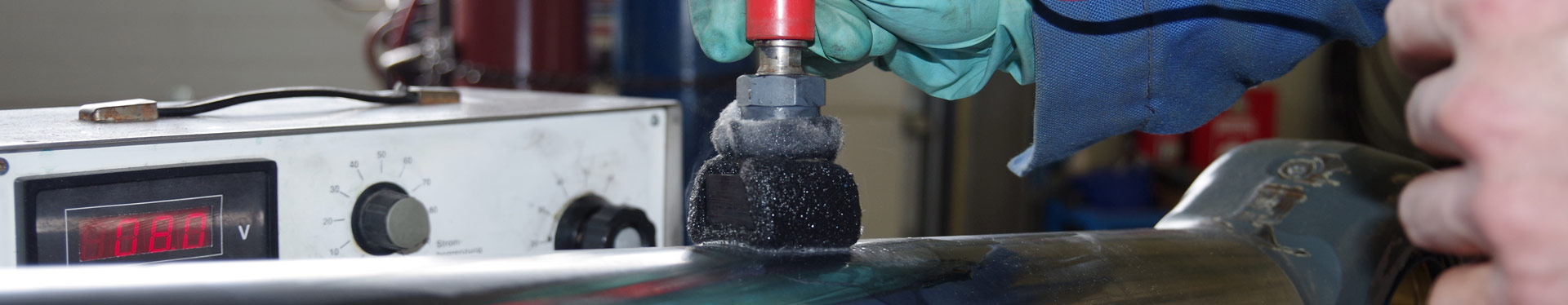 Das Tampongalvanisieren ist ein Sonderverfahren der Galvanotechnik. Die Anwendung dieser mobilen Technik ermöglicht es uns, punktuelle Schäden an verchromten Kolbenstangen vor Ort zu reparieren. Die Besonderheit bei der Verwendung dieser Technik ist, dass die Hydraulikzylinder in den meisten Fällen nicht einmal ausgebaut werden müssen und die Kolbenstangen im eingebauten und ausgefahrenen Zustand repariert werden können.
